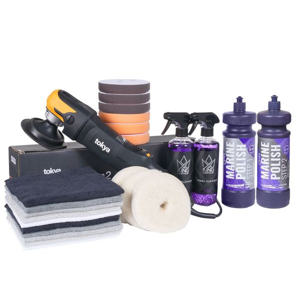 Tokya RP8 Gen2 Boat - DELUXE er en svært omfattende båtpoleringspakke. Pakken inneholder praktisk talt alt som trengs for å polere og fjerne både dype riper og oksidering samt mindre defekter. DEUXE-pakken er det perfekte svaret for å redde overflater i virkelig dårlig forfatning som krever mer kjærlighet enn lett polering gir. En ergonomisk, effektiv og brukervennlig maskin, kombinert med et omfattende sett med poleringsputer og to poleringsmidler i ulike kvaliteter, spesielt utviklet for båtmaling og gelcoatoverflater, sikrer at selv en overflate i dårlig forfatning kan bringes til å skinne igjen med produktene i pakken!