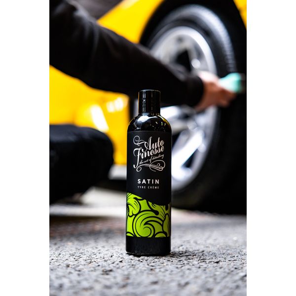Auto Finesse Satin Tire Creme er en vannbasert dekkglans som absorberes dypt inni dekkets gummistruktur, gir næring, samtidig som det bekjemper bleking og sprekkdannelser. En behandlet flate forbedrer ikke bare dekkets utseende, det gir også beskyttelse mot UV-stråling. Ettersom middelet resulterer i en blank flate, må produktet ikke påføres på dekkets kontaktflater.