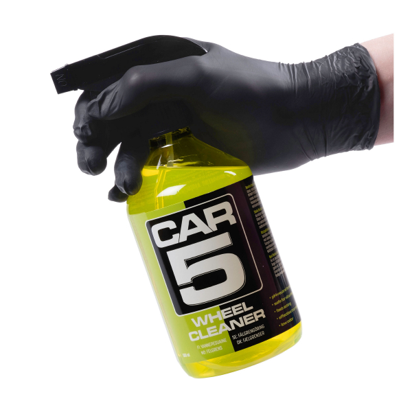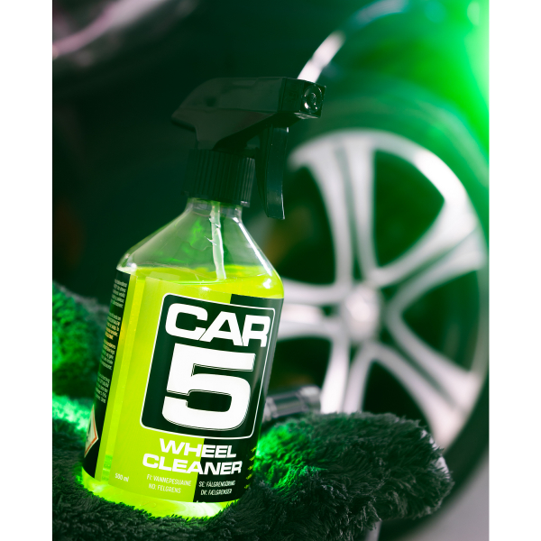 CAR5 Wheel Cleaner er et hurtigvirkende, effektivt og pH-nøytralt rengjøringsmiddel som passer til alle typer felger. Wheel Cleaner består av ingredienser som reagerer og fjerner både konvensjonelt og jernbasert smuss, som bremsestøv. Fordi CAR5 er pH-nøytral, er den skånsom og egnet for påføring selv på lakkerte overflater, noe som gjør den til et veldig kostnadseffektivt alternativ. For å oppsummere CAR5 Wheel Cleaner, er det både en brukervennlig felgrenser og flyrustfjerner, som er egnet for både hurtigvask og grundig vask. I tillegg er produktet helt syrefritt, noe som gjør det helt trygt for alle bilens utvendige overflater.