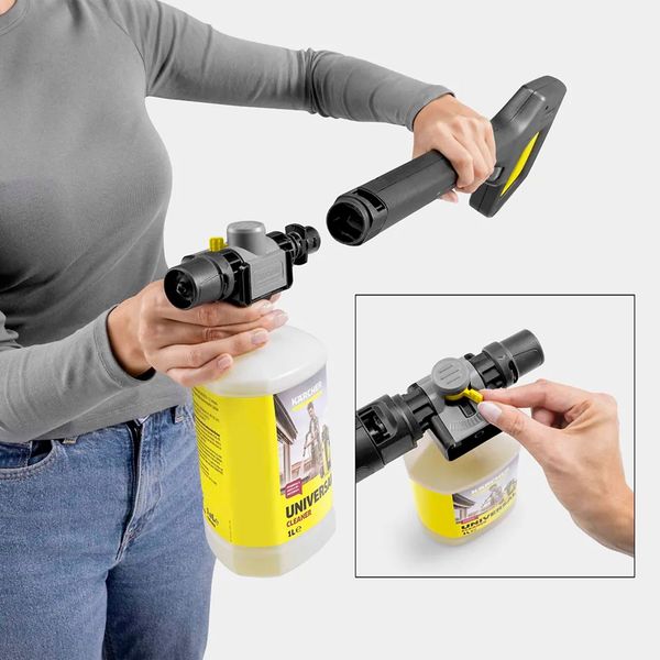 Displayet er integrert i håndtaket, og knappene for trykk- og kjemikaliekontroll er praktisk plassert rett ved tommelen, noe som gjør det enkelt å justere innstillingene i farta. Fra håndtaket kan du også aktivere eco!-modusfunksjonen, som reduserer både energi- og vannforbruket. 4-i-1 Multi Jet-slangen har fire ulike spraymønstre: den punktformede Dirt Blaster for gjenstridig smuss, en flat høytrykksstråle, en bred flat stråle med redusert trykk (ca. 50 % av maks.) og en tradisjonell stråle. Takket være Multi Jet-røret kan du bruke det samme utstyret til å vaske alt fra biler og sykler til utemøbler og belegningsstein.