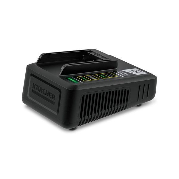 Hurtiglader for Kärcher 18V-batterier, utstyrt med intelligent ladeteknologi, integrert overladingsbeskyttelse og LED-indikator. Et 18V/2,5Ah-batteri lades til 80 % på kun 44 minutter!