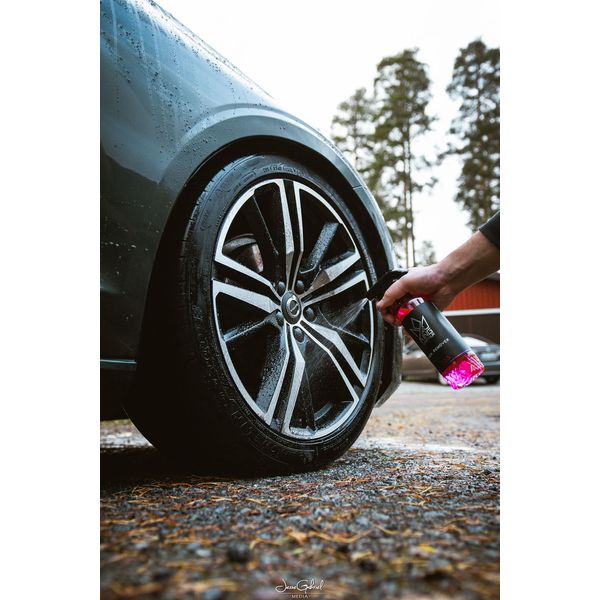 Men på grunn av effektiviteten til King Carthur Iron Remover, oppnås et rent resultat veldig enkelt om ønskelig: spray middelet på felgene ca. 5 minutter før forvask. Etter virketiden, skum bilen inkludert felgene (ikke skyll metallpartikkelfjerneren i mellom). La skummet virke på overflaten, og skyll deretter skum- og metallpartikkelfjerneren grundig.