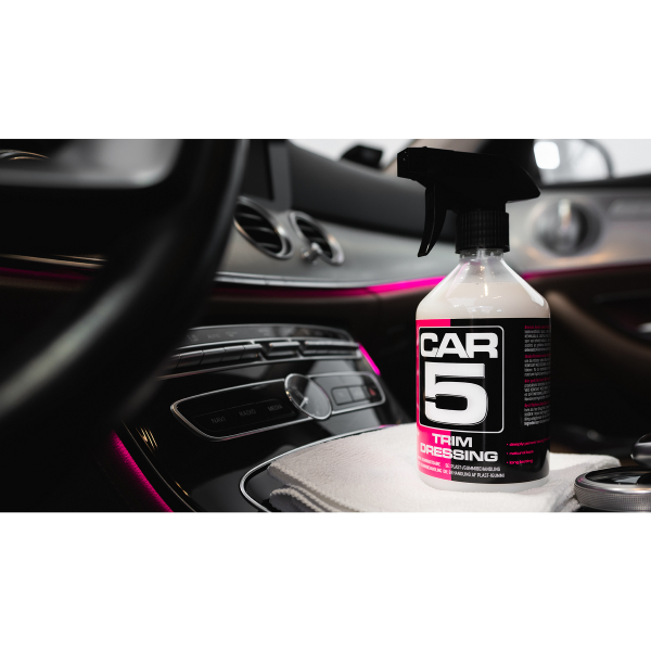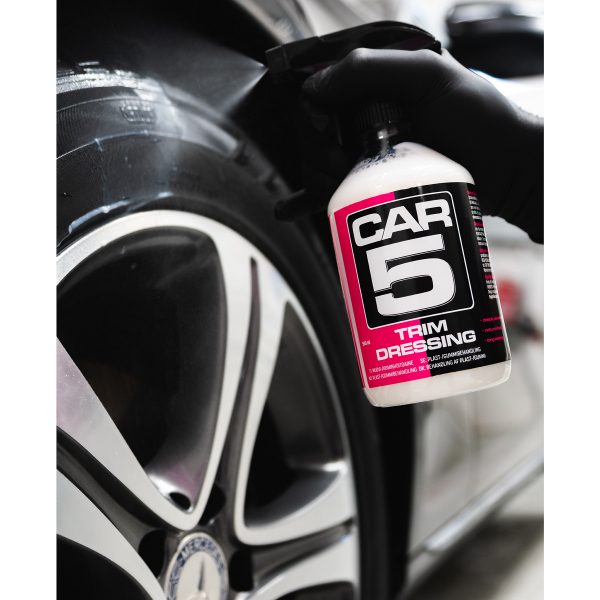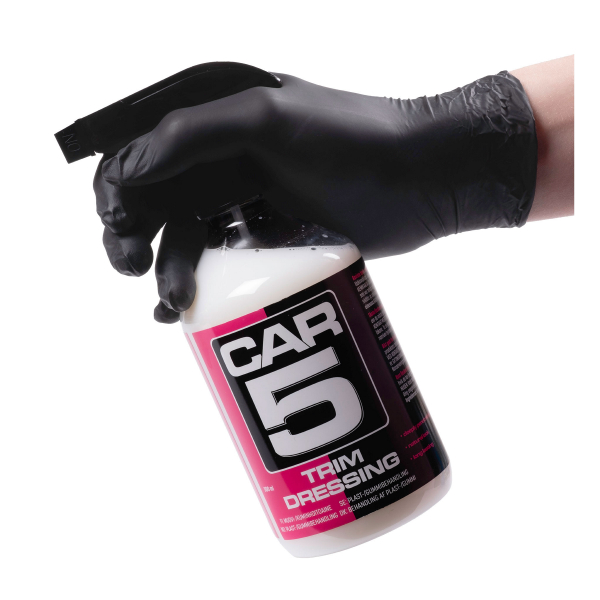 CAR5 Trim Dressing leveres ferdigblandet og klar til bruk i en sprayflaske. Takket være spraymunnstykke av høy kvalitet, blir det enkelt å påføre middelet på overflatene som skal behandles. CAR5 Trim Dressing er veldig enkel å bruke: Den kan sprayes enten direkte på overflaten som skal behandles eller på en ren mikrofiberduk, påføres og tørkes av. I tillegg er stoffet veldig tilstrekkelig, en 500 ml flaske er nok til flere biler.