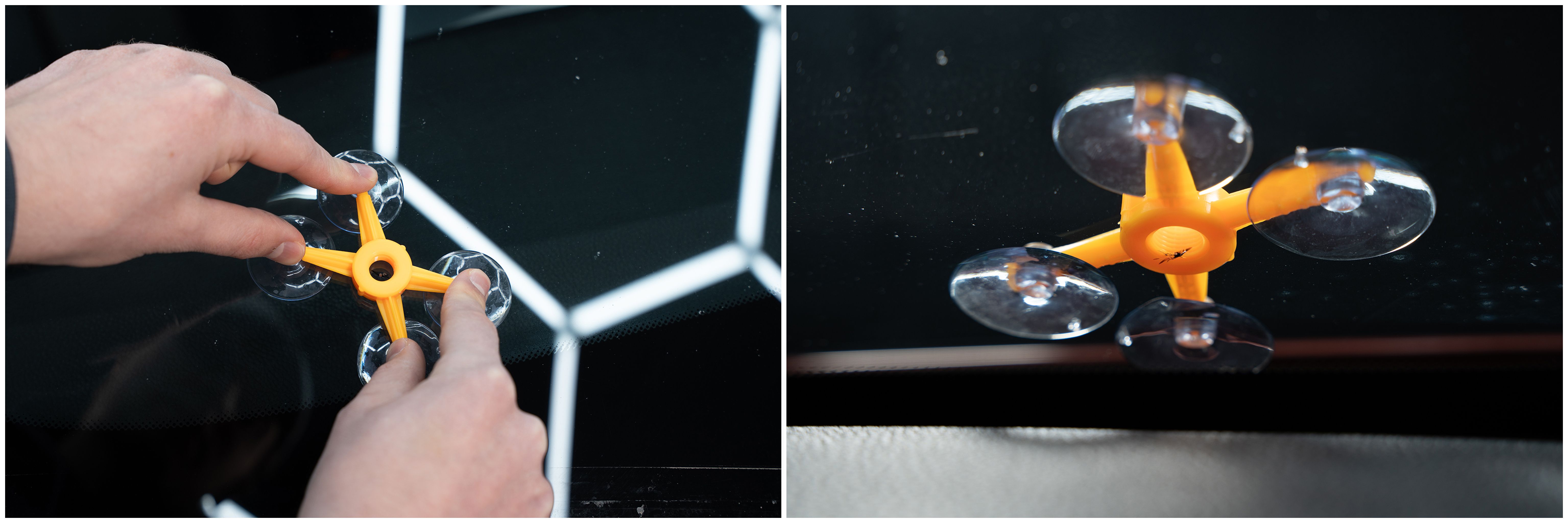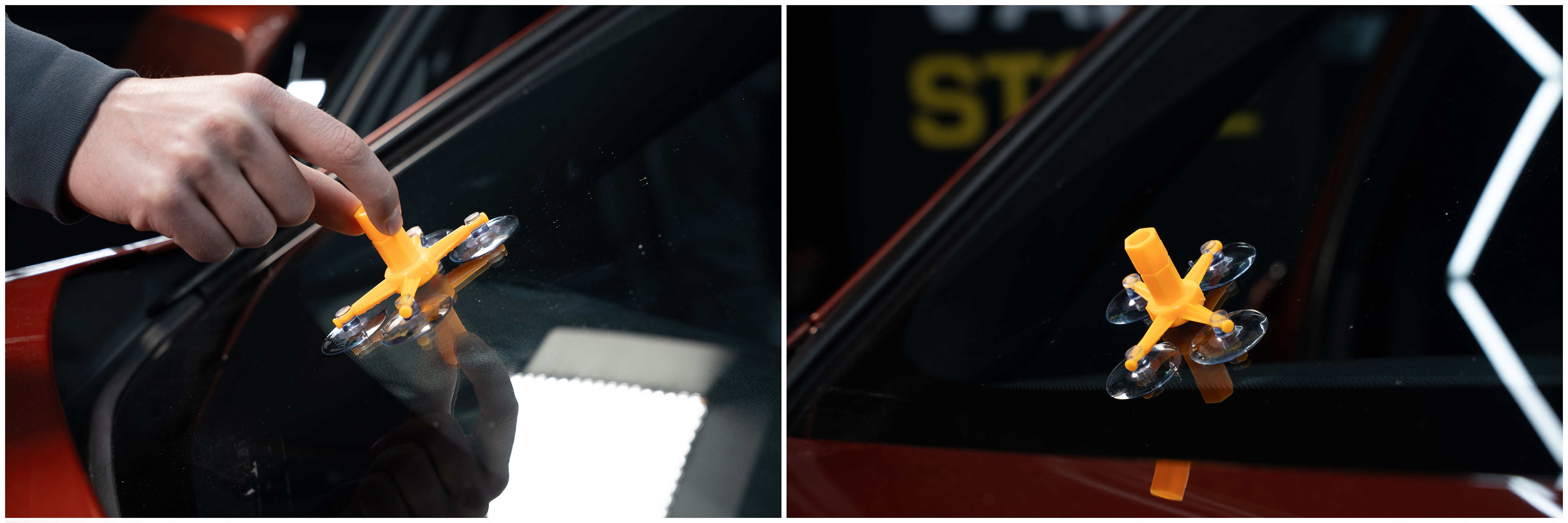2. Fest stativet til frontruten. Sentrer åpningen på stativet nøyaktig over skaden, og pass på at sugekoppene ikke dekker noen sprekker.