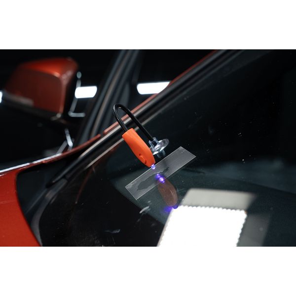 5. Kontroller skaden i en vinkel på omtrent 45° og sørg for at det ikke er luftbobler igjen i skaden. For splinter- eller bull's-eye-skader, se rett bak skaden. Fjern trykkpinnen for å slippe ut luft som er fanget inne. Drei harpiksbeholderen og trykkpinnen sammen en halv omdreining mot klokken. Fjern hele enheten ved å løfte de små håndtakene på sugekoppene. Tilsett en dråpe harpiks på de synlige områdene og dekk dem med en herdefilm. Plasser filmen forsiktig på plass uten å trykke. Bruk et barberblad (på toppen av filmen) til å spre harpiksen og fjerne luftbobler. Flytt kjøretøyet ut i direkte sollys (ca. 15-20 min) eller bruk UV-lys (ca. 3-5 min) for å herde harpiksen. Fjern overflødig harpiks med et barberblad.