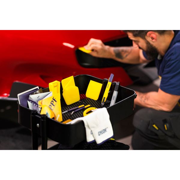 Gyeon Q²M PPF Installer Kit er en komplett sett med verktøy som er avgjørende for en vellykket montering av PPF. Settet inneholder verktøy som dekker alle behov: Med en unik føringskniv, en detaljkniv, en praktisk oppsamlingsboks for brukte knivblader, pinsett, et bredt utvalg av skrapere og monteringshansker. Ved hjelp av dette tilbehøret går alle PPF- og vinylinstallasjoner knirkefritt uten ekstra overraskelser, og arbeidet går greit selv på ujevne og vanskelige former. Med PPF Installer Kit får du alt det profesjonelle tilbehøret til verktøykassen din på én gang!